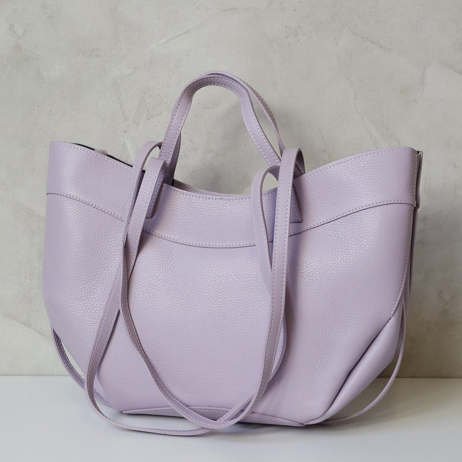 Elegancka, duża torebka z najwyższej jakości, włoskiej, naturalnej skóry licowej. Skóra wyprawiana i barwiona wyłącznie naturalnymi garbnikami i barwnikami pochodzenia roślinnego i mineralnego. Torebka zapinana na zamek, wnętrze bez podszeki, z kosmetyczką.